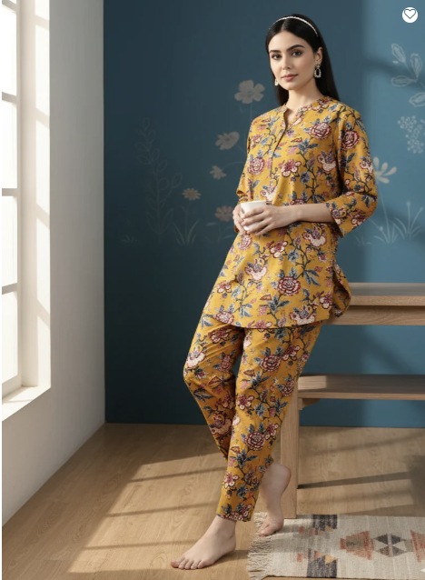 3. Mustard Yellow Floral Cotton Pyjama Set – Bright and comfortable, this pyjama set fits Valentine’s Day when it’s spent laughing, lounging, and turning the night into a shared, feel-good moment.